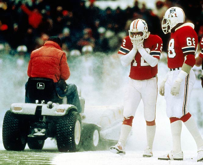 1982 – John Smith of the Patriots kicks a late field goal in a snow storm, against Miami, accounting for the games only points. Some people claim that the sudden appearance of a snow plow to clear the spot he was to kick from had something to do with his success. The NFL later bans snow plows from the sidelines during games.